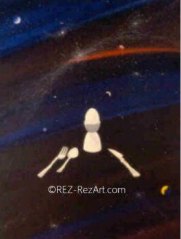 created sun rises in the sea of space. Man is beckoned into space. He explores